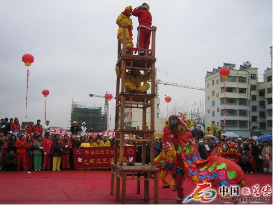 高臺是用5至7張八仙桌一層層疊壘,最上面的桌子四腿朝天,總高度近8米。四人登臺表演。兩個人扮獅子,把獅頭獅皮披在身上,只露雙腳;另外兩人分別裝扮成孫悟空和笑臉和尚揮舞手帕,大蒲扇逗引獅子逐層攀上高臺,為了穩(wěn)固,安全起見,每張桌子的四角都用草紙疊浸水后墊著防滑,做到萬無一失。