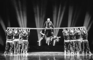 在靜謐的夜空下,首先映入觀眾眼簾的是群舞演員在舞臺中央,用身體構(gòu)建的人字形“情人房”。房內(nèi)的瑤族姑娘正在小憩,或許是被屋外的動靜驚醒,她推門出外察看,重重的門軸聲劃破了夜的寂靜,原來是愛慕者正攀在一根竹竿上向自己示愛?!盁o竹不成瑤”,舞蹈伊始,最核心的道具——一根長約8米、杯口粗的竹竿就出現(xiàn)了。借助竹竿,群舞演員通過造型組合及隊形變換,不斷再現(xiàn)生活場景:山坡上、小橋上、屋檐下、窗欞邊……情隨景遷、情景交融,生活圖景和人物情緒巧妙地融合在一起,營造出一種別樣的意境,極大地引發(fā)了觀眾的聯(lián)想。