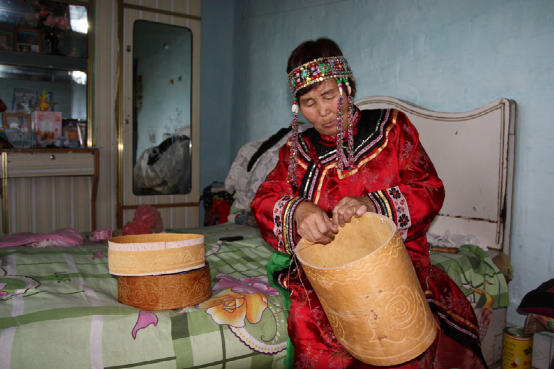 鄂倫春族素有“白樺民族”之稱,白樺樹皮制品種類非常多,大到可以乘人載物的樺皮船、圍蓋“仙人柱”的“鐵克沙”,小到可以裝在衣兜里的煙盒和含在口中的狍哨,提水用的桶、采集用的簍、裝物用的箱、盛飯用的盆、吃飯用的碗、喝酒用的蠱等等。樺樹皮制品的裝飾圖案可以通過(guò)壓劃、壓?。c(diǎn)刺)、剔刻、烙燙、補(bǔ)花、繪畫等多種方法形成。壓印點(diǎn)刺是最常用的裝飾手段,工具是用獸骨制成的,分單齒、雙齒、多齒和簡(jiǎn)單幾何形幾種。先在剪裁好的器物材料上,用壓、打等方法點(diǎn)刺出裝飾紋樣,再縫合成器物成品。這種裝飾多為素面凹形花紋,顯得樸實(shí)單純,而且器物越陳舊樺皮顏色越深,越有光澤,圖紋越清晰。也有人在壓打線上著色,這便形成了另一種風(fēng)格,美觀艷麗而且突出了物象特征。