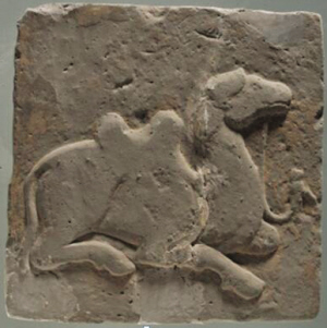 邊長20.5厘米,厚5厘米,呈正方形。駱駝構(gòu)圖充滿整張畫面。雙峰駝呈臥姿,頭部昂起,似乎是在傾聽什么,韁繩拴在木樁上,像是在等待主人拿來美味的草料。駱駝造型比例恰到好處,生動傳神。