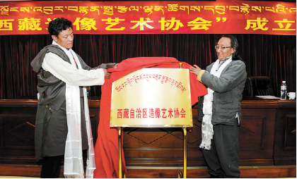 2017年12月3日,西藏造像藝術(shù)協(xié)會在拉薩成立。 圖為該協(xié)會會長朵普·次嘎(左)與西藏民族藝術(shù)研究所副所長阿旺丹增共同為協(xié)會揭牌。