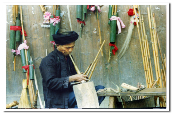 蘆笙分為母五、六、七、八、九和母五小六、母六小七、母七小八、母八小九、九五等十個(gè)種類。每制作同一種類的蘆笙為一堂,每堂蘆笙由大、中、小和地筒組成,通常為三十至五十把。