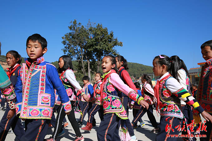 伴隨著三弦琴悠揚(yáng)的旋律和整齊的舞步聲,我們走進(jìn)云南省楚雄市大過口鄉(xiāng)中心民族小學(xué)校園,映入眼簾的便是身著彝族服裝的老師和學(xué)生們,他們?cè)诓賵?chǎng)上圍成了三個(gè)大圓圈,用彝語和漢語歡快地唱著跳著。進(jìn)入大圈里,近距離看著手捧三弦琴的高年級(jí)同學(xué),還有那些奮力吹著葫蘆笙的男同學(xué)們,別有一番氣勢(shì)。而那些圍成兩個(gè)小圈的低年級(jí)學(xué)生們,在陽光下邊唱邊跳彝族三弦舞,青春的朝氣蕩漾開來。