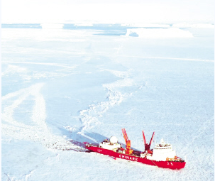 “雪龍”號是中國最大的極地考察船,也是中國唯一能在極地破冰前行的船只?!把垺贝秃芤?.5節(jié)航速連續(xù)沖破1.2米厚的冰層(含0.2米雪)。簡單來說,“雪龍”號船底有許多密封艙,破冰時先把后部的密封艙用幾千噸的海水灌滿;這樣船頭自然翹起,壓騎至冰面之上;然后再把前部的密封艙灌滿海水,后部的海水排出,利用船體前部的巨大壓強(qiáng),把堅(jiān)冰壓裂破開。