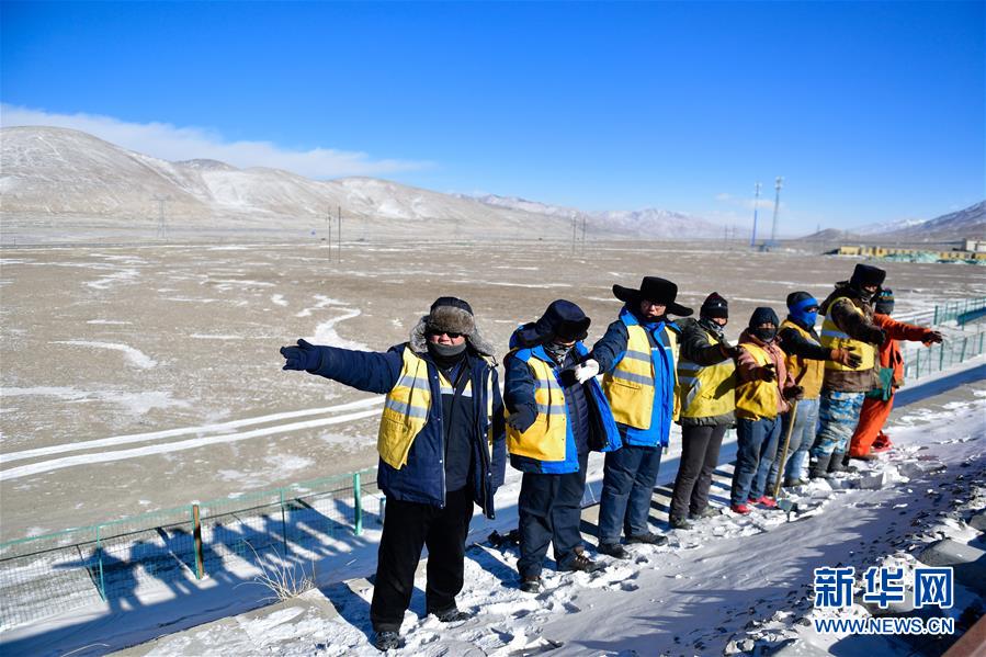 1月12日清晨,于本蕃(中)與工友在昆侖山口附近的青藏鐵路上施工。(新華社記者張龍 攝影)