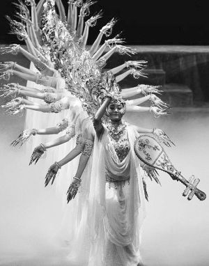 在敦煌舞的動(dòng)作素材積累方面,無論是對(duì)敦煌壁畫舞姿的歸類、整理,對(duì)“敦煌舞特有的S型曲線運(yùn)動(dòng)規(guī)律”的發(fā)現(xiàn),以及“運(yùn)用中國古典舞蹈的節(jié)奏韻律,把靜止的姿態(tài)與其風(fēng)格統(tǒng)一的動(dòng)作過程結(jié)合起來,形成比較完整的舞蹈運(yùn)動(dòng)和造型體系”,還是在創(chuàng)作層面上《絲路花雨》對(duì)“反彈琵琶”典型壁畫舞姿的發(fā)展,《千手觀音》對(duì)“千手”舞姿造型的無限變化發(fā)展,以及《飛天》超越人體動(dòng)作范圍極限對(duì)“三道彎”典型敦煌舞姿風(fēng)格的強(qiáng)化等,都是敦煌舞在動(dòng)作素材層面的積極建設(shè)和發(fā)展。