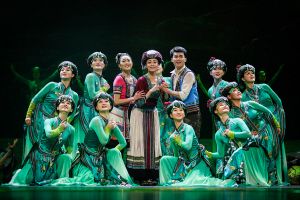 在舞劇敘事方式上,總導(dǎo)演之一董華興將民族性與現(xiàn)代性相融合,嘗試時空切換,段落重組,故事情節(jié)的倒敘、插敘,真實性與虛擬性相結(jié)合等方法?!耙魳分谱鳌⑽璧刚Z匯、服裝設(shè)計等方面都要符合當(dāng)?shù)厝罕姷纳?,接地氣老百姓才會喜歡?!薄缎腋;ㄉ健房倢?dǎo)演之一馬文靜說。
