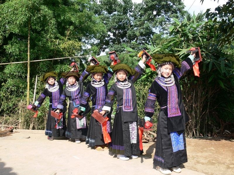 板凳舞,苗語(yǔ)稱(chēng):“卡牛檔”。關(guān)于它的起源,在黑苗中一直這樣流傳:相傳在很久以前,寨中的男子都參軍打仗去了,剩下老人、婦女和小孩,由于地處高山,深林密布,經(jīng)常有野獸出沒(méi),婦女們?yōu)榱藟涯懀滋焱砩隙枷矚g聚在一起,用小板凳互相擊打,敲出聲響,驅(qū)趕野獸……漸漸地,就慢慢演變成了在當(dāng)?shù)孛缱鍕D女生小孩辦滿(mǎn)月時(shí),拿小板凳敲擊舞蹈祝福小孩的習(xí)俗。