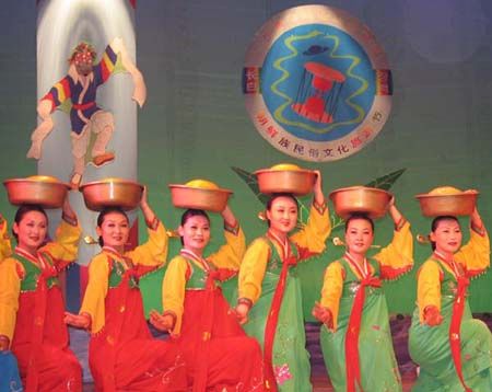 頂水舞因舞者頭頂水罐起舞而得名,是朝鮮族女性表演的傳統(tǒng)舞蹈。朝鮮族婦女習慣用頭部頂著器物行走,在插秧、鋤草季節(jié),婦女們常頭頂水罐將飲水或米酒等送至田間地頭。頂水舞即在這種生活習俗基礎上形成,而且一經形成,便在群眾中間廣泛流傳。上世紀50年代初期,頂水舞在延邊各地隨處可見,成為當地群眾最廣泛的民間舞蹈之一。舞者頂的水罐,原是生活中的實物,后來為了便于起舞,多用紙糊的罐型道具,在表層上繪以漂亮的花紋,輕巧別致。隨著道具變化,舞蹈動作也相應發(fā)展。頂水舞以“挫墊步”“踏波步”“碎步”為基本步伐,主要動作有“甜泉舀水”“玉指彈珠”等。舞蹈通過模擬頂罐行進中的各種動作,抒發(fā)歡樂喜悅的內心感情,舞姿輕松優(yōu)美。