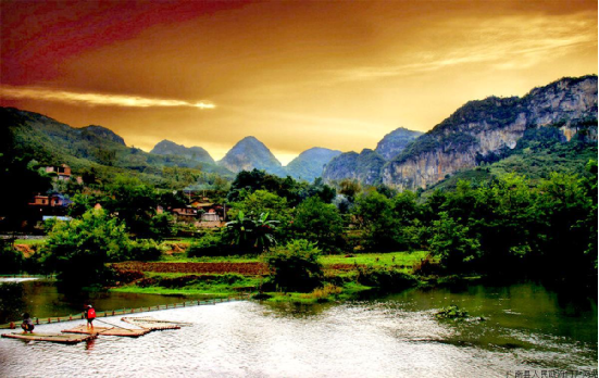 壩美,為壯語譯漢語為:壩—沖口,美—樹 ,因居住的沖口樹木多而得名。壩美村位于珠江流域西江水系馱娘江上游的阿科河畔。屬喀斯特地貌,區(qū)域內山峰奇特,河谷幽美,阡陌縱橫,河流山泉蜿蜒奔流,溶洞層疊散布在山體峰內,冬無嚴寒,夏不酷暑,氣候宜人。因四面環(huán)山,不通公路,進出寨子主要靠村前村后兩個天然的石灰溶巖水洞,村民們要摸著巖壁趟水、撐竹筏、劃獨木舟、坐小船,經(jīng)過950米長的幽暗的“出水洞”和680米長的“湯拿洞”才能進出。由于地處偏僻,交通不便,基本不與外界交往,多年來壩美村長時期與外世隔絕。壩美村水源豐富,氣候溫和,自然生態(tài)環(huán)境未被污染,負氧離子質數(shù)高出城市數(shù)倍,游人在此休憩,心曠神怡,是一個溫濕潤,四季宜人的旅游勝地。就生態(tài)環(huán)境和歷史淵源來說,《桃花源記》問世1500多年,只聞其名,不見其實。相傳除唐代確認湖南省桃源縣的桃源洞為其原型外,目前全國就有冠名“世外桃源”的地名16個之多。而今天的壩美,不僅十分相似,而且還神似東晉文學家陶淵明筆下所描寫的“林盡水源,便得一山。山有小口,仿佛若有光;便舍船從口入……土地平曠,屋舍儼然,有良田美池桑竹之屬;阡陌交通,雞犬相聞……”的世外桃源。而且在當?shù)卮迕裰杏性S多歷史傳說:北宋皇祐四年(公元1052年),壯族起義領袖儂智高在邕州(南寧)昆侖關被狄青打敗后,退入以其繼父儂夏卿為首領的特磨道(廣南)后,至和二年(1055年),宋朝廷又派楊文廣領兵進剿,儂智高在突出重圍轉至阿科(今廣南縣壩美鎮(zhèn)治所)與宋軍周旋,終因寡不敵眾而離開阿科轉戰(zhàn)于丘北、開遠、蒙自、元江等地,后到大理不知所終。