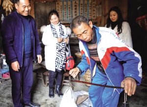 在村里修復(fù)舊屋的趙貢彩接到游客電話,馬不停蹄地趕回家中,自家手工制作的苕粉成了游客心心念念的香餑餑。拿出早已生銹的秤桿,一袋袋苕粉被游客搶著購買?!岸际橇糁约页缘模南胫苜u出去喲?!毙χf罷,趙貢彩拿出手機(jī),微信一掃,錢款立即到賬。