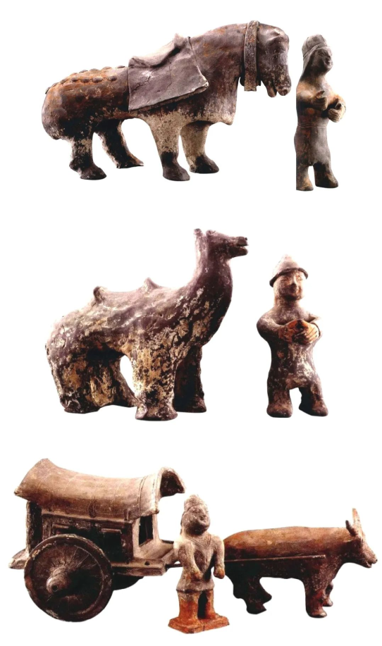 墓葬形制方面,大學路北魏墓弧方形墓室結構,是在中原漢晉方形墓葬形制基礎上,融入了游牧民族圓形穹廬造型因素形成的新結構,并對其后的隋唐墓葬也產生了一定影響。隨葬陶器中,根據(jù)陶俑的衣著及相貌,可分辨出既有漢人、鮮卑人形象,可能還有西域胡人形象,體現(xiàn)出當時各族人群共同生活的場景;家禽及牲畜等動物形象中,中原定居民族喜見豢養(yǎng)的雞、犬、豬等禽畜類與游牧民族賴以生存的羊、馬、牛及駱駝等牲畜類動物共處的現(xiàn)象,體現(xiàn)了農耕和游牧凝于一體的生產生活方式。雖然這座墓葬的墓主族屬身份已無法考辨,但墓葬所體現(xiàn)的民族融合、文化融匯的氣息十分強烈。