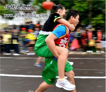 在昌江黎族自治縣一帶流行。每年的農(nóng)歷十五前后,孩子們就聚居在一空曠地,舉行村與村之間比賽??筛鶕?jù)人數(shù)來分組,每組2人(一男一女),每次由兩組進(jìn)行,實(shí)行淘汰制,男背著女或女背著男亦可,與對(duì)方互相碰撞,男女通過踢、拉、推等動(dòng)作,千方百計(jì)地把對(duì)方背著的人或拉下,或把兩人分開,或倒地。在場觀看的人興高采烈,笑聲不斷,其樂無窮。