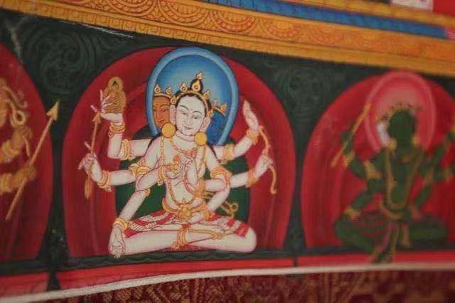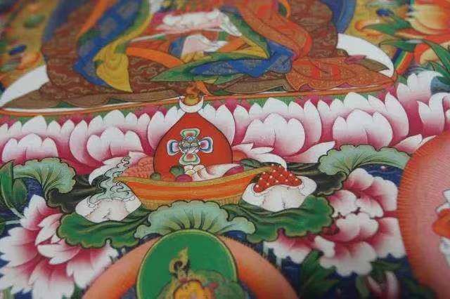 900多年前流傳于衛(wèi)藏地區(qū)(現(xiàn)山南)的齊烏崗派唐卡,由雅堆·齊烏崗巴創(chuàng)立,與嘎瑪嘎赤畫派、勉塘畫派、欽孜畫派、埃赤畫派并稱“唐卡五大畫派”。齊烏崗派特點為人物體形飽滿、生動細膩,色彩以棗紅、橘紅暖色系為主;中央的主尊突出,背景多用卷草紋作為裝飾。特別是,齊烏崗派唐卡的佛像肩膀旁都有象征翅膀的“三角”,源于創(chuàng)始人齊烏崗巴行動靈敏,亦被稱作“齊烏派”。