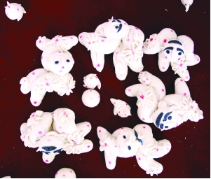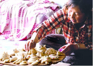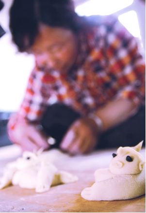在和林格爾縣的廣大農(nóng)村地區(qū),有些年長(zhǎng)的婦女幾乎都是技藝高超的面塑高手。就捏制風(fēng)格來(lái)說(shuō),和林地區(qū)面塑風(fēng)格古樸、粗獷、豪放、深厚,卻不乏細(xì)致、優(yōu)美、精巧。它主要以以面粉為主料,調(diào)入不同色彩的食用顏料,用手指和簡(jiǎn)單工具剪刀、梳子、篦子、竹針等,塑造各種栩栩如生的形像。