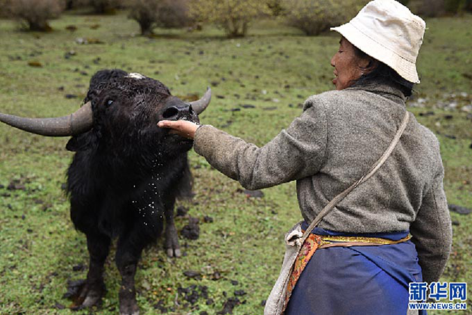 2018年5月9日,跟隨“新時(shí)代·幸福美麗新邊疆”網(wǎng)絡(luò)主題活動(dòng)的隊(duì)伍,記者來到玉麥,見到了卓嘎本人。從北京回到玉麥的卓嘎,又變回了那個(gè)樸實(shí)的放牧守邊人。見到卓嘎時(shí),她正拿著飼料準(zhǔn)備去山上的草場(chǎng)喂牛。這也是她每天最忙碌的時(shí)刻。