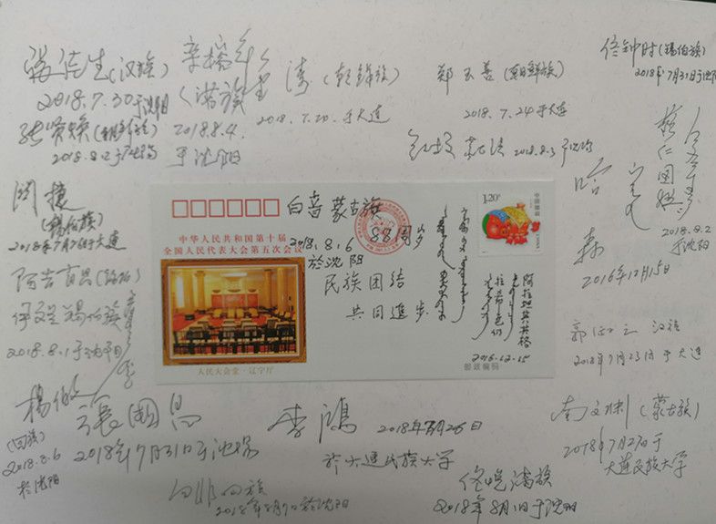 在采集口述影像錄音資料的同時,項目組還收集了大量的珍貴歷史照片以及相關(guān)文物。值得一提的是,他們設(shè)計了一種非常有特色的受訪者簽名簿,中間貼著繪有56個民族的音樂舞蹈圖案的首日封或明信片,四周簽上受訪者的人名簽名字、民族特征,有些還用民族文字書寫,體現(xiàn)了中華各民族團(tuán)結(jié)在一起的精神風(fēng)貌。簽名簿有厚厚的幾大本,設(shè)計精美,承載著民族工作口述史資源采集的經(jīng)歷,具有豐富的文化內(nèi)涵和博物館收藏價值。