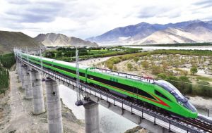 蒼翠的雅魯藏布江河谷中,全新的復(fù)興號(hào)列車呼嘯而過,與奔騰的江水一起向著“西藏江南”林芝駛?cè)ァ?/p>
