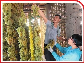 游客在吐魯番市高昌區(qū)葡萄鎮(zhèn)體驗采摘晾制葡萄