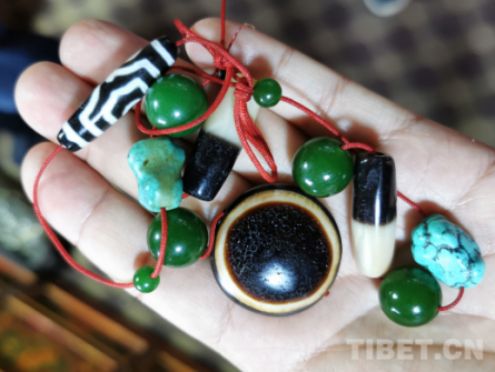 商家們一般把天珠分為幾類。第一類是印度的天珠,經(jīng)營這類天珠的商家很少,這些珠子也主要是賣給游客,要價(jià)一般每顆在150-300元之間。第二類是臺(tái)灣天珠,經(jīng)營者較多,多數(shù)商家將其看作普通飾品,目標(biāo)群體也主要是游客,每顆的價(jià)格在50-800元之間。第三類,也就是在那里大家常說的“真天珠”或“老天珠”,價(jià)格每顆一般從幾千元起,至幾十萬元不等。當(dāng)然,在第三類中,除了天地珠、虎牙珠等花紋形式外,天珠上“眼睛”的數(shù)量也很重要,一般地,好天珠上的眼睛越多,價(jià)格最高。在當(dāng)?shù)厣碳液娃r(nóng)牧民看來,一顆上好的九眼天珠真的是價(jià)值連城。