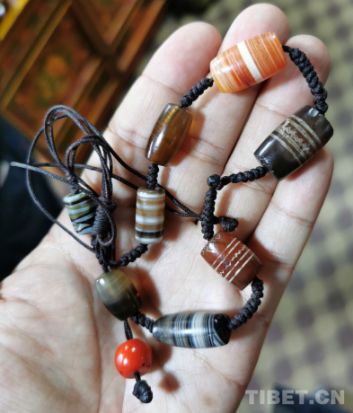 瑪瑙在那里也充滿了神秘感,纏絲瑪瑙尤其如此。但整體上,與天珠相比,纏絲瑪瑙的辨別方法更簡單一些,分類也沒有天珠那樣復(fù)雜。在市場中,商家一般只將瑪瑙分成兩類:一類是新瑪瑙,另一類是老瑪瑙。不知是商家不屑,還是缺少消費(fèi)人群,新瑪瑙在市場中并不多。有天珠,尤其是好天珠的商店多有老瑪瑙,商家更多時(shí)候喜歡將二者放在一起銷售。老瑪瑙其辨識(shí)標(biāo)準(zhǔn)與天珠相似,只不過瑪瑙沒有“眼睛”之說;纏絲瑪瑙的“纏絲”數(shù)量和形態(tài)一般也不太重要,除非數(shù)量或形態(tài)極為特殊,可能此時(shí)最重要的標(biāo)準(zhǔn)就成為“物以稀為貴”了。當(dāng)然,老瑪瑙的價(jià)格一般也較高,多集中于每顆幾千至幾萬元。