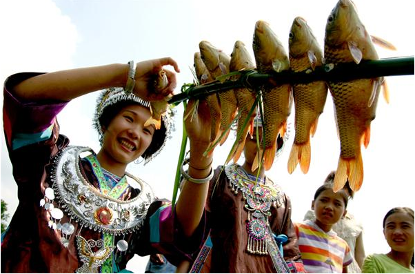 燒魚是廣西融水苗胞的習(xí)俗之一,融水的苗族同胞素有在稻田里養(yǎng)魚的習(xí)慣,每年春插,苗家人向來喜歡在稻田里放養(yǎng)鯉魚。每年的秋收稻黃時(shí)節(jié)也是田鯉肥壯之時(shí),這時(shí)來自四鄉(xiāng)八寨眾多的各民族兄弟便匯聚起來,點(diǎn)燃一堆堆篝火,燒田鯉吃野餐,盡享豐收喜悅。燒魚從9月稻黃收割開始持續(xù)到12月底才正式結(jié)束,故名“元寶山金秋燒魚季”。燒魚季節(jié),苗寨家家戶戶釀起醇濃的甜酒,蒸著香噴噴的糯米飯,帶上食鹽、辣椒、蒜苗、蔥花、薄荷等佐料上山去剪禾。晌午時(shí)候,他們?cè)谔镱^或田邊的平地?zé)鹨欢讯洋艋?,從田里抓來一籠籠活蹦亂跳的鯉魚,用樹枝或竹片把魚一條條串起,排成一排,然后放在紅彤彤的火炭上翻來覆去地烤,大約半小時(shí)左右,魚被烤炙得“呲呲”作響,水分烤干,慢慢地變黃,直至熟透,香飄四溢,遠(yuǎn)遠(yuǎn)就可聞到香味。