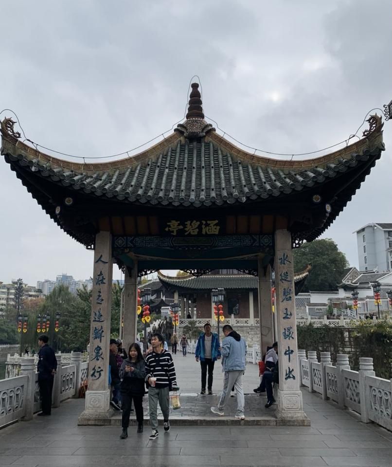 第一部分是石牌坊、浮玉橋和涵碧亭。漢白玉石牌坊上書“城南勝跡”四個大字,立柱的“抱鼓石”為八尊石獅子,石獅尾朝上頭朝下,活靈活現(xiàn),富有生氣。穿過石牌坊走上浮玉橋,橋體連接南北兩岸,其名來源于其質(zhì)地,由貴州特產(chǎn)白棉石打造,從遠(yuǎn)處看猶如一條玉帶浮在水面。橋上的涵碧亭是古人納涼休息的地方,因橋下有深潭“涵碧潭”而得名,亭子四柱上刻有兩幅對聯(lián),分別是“水從碧玉環(huán)中出,人在青蓮瓣里行”、“銀漢浮空星過水,玉虹拖雨雁橫秋”。