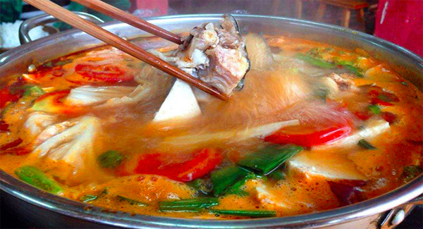 一、用魚醬烹調(diào)的酸湯魚在永樂當(dāng)?shù)厥窍喈?dāng)盛行的;因?yàn)榕胝{(diào)佳品魚醬在永樂當(dāng)?shù)叵喈?dāng)普遍,用它烹調(diào)出來的酸湯魚的味道是麻、辣、酸、鮮五味俱全,也是苗鄉(xiāng)一道有名的火鍋。